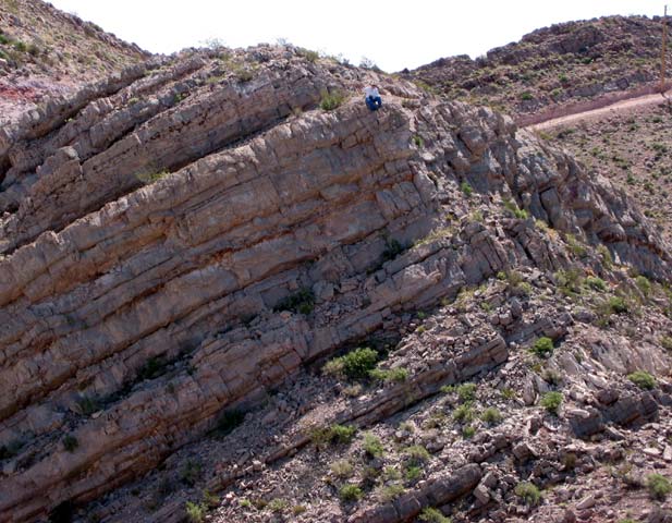 Since we didn't (couldn't) return the way we came up, we decided to try hiking down a canyon that began at the low point of the road to the towers. The wash looked promising for the first 3/4 mile; we even came to a 30' dry fall and found an easy way around it. Then, just when we thought we had it made, the canyon narrowed between sheer rock walls and the bottom dropped out at another dry fall with no way around. Howard was sure that we could go over another ridge or two to find a passable canyon. Since we were dangerously low on water, I insisted that we retrace our steps and return via the road. It would be a LOT longer but at least it was a "known" route. I kept thinking about those guys who died last year hiking out of the hot springs and didn't want to chance running into another "dead end" (excuse the pun).