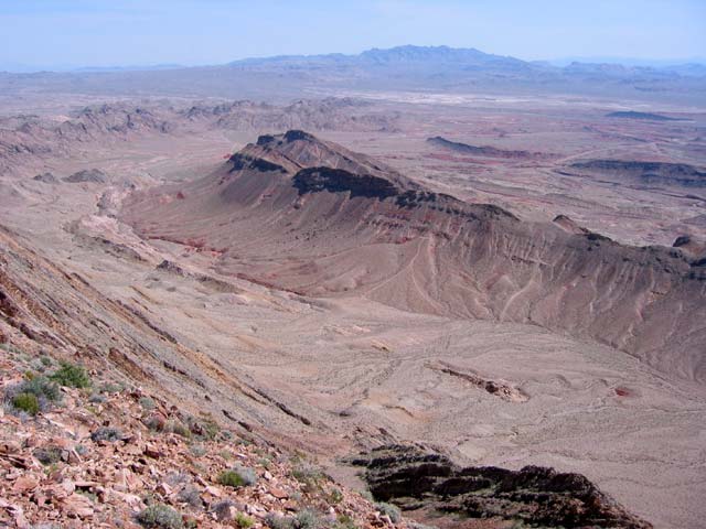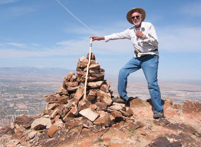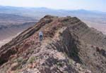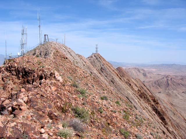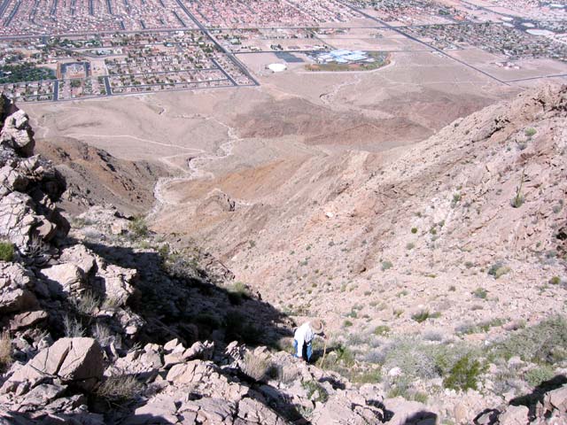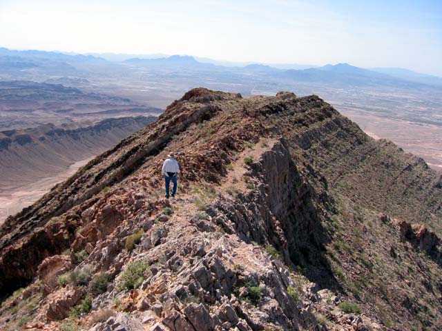 The view from the top was outstanding. We had been watching the Las Vegas valley all the way up, so the view of the lake and interim canyons with mining roads stopping half way up their ridges was a treat. The east side of the mountain is even steeper than the side we came up. It might not be shear, but you wouldn't do much more than bounce for the first 2,000 feet. Our first order of business was to hike along the ridge so we could add a rock to Roger's cairn. Then it was back past the towers to bag a geocache. Howard found a comfortable perch while Bob logged the cache.