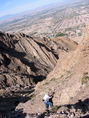 Our good friend, Howard, lives at the base of Frenchman Mountain. He knows that there are two reasonable ways to climb it, but insists that there is a third (his) route. Six of us (3 men and 3 ladies) tried to climb a similar route last year but had to stop a few hundred feet short of the top (for safety reasons). This time he made it clear that "safety will not be an issue". This time just two of us tried it.