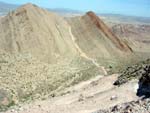 The canyon that we chose to ascend got steep very quickly and the loose scree made for treacherous footing. We worked our way along the side so we could have something to hold on to. Then we spotted a solid rock channel on the other side of the canyon and slowly worked our way across the scree to solid ground. The good news was that we were off the slippery scree. The bad news was that the rock channel needed to be climbed; not hiked! I commented that going down was going to be really dangerous. His response was "then keep going UP!" For a long time, we couldn't see the top and didn't know how much farther we had to go. Suddenly, we cleared a ridge and we were there. Howard had me take a picture of his watch to show that we made it up the 2,000 feet in just 2 hours.
