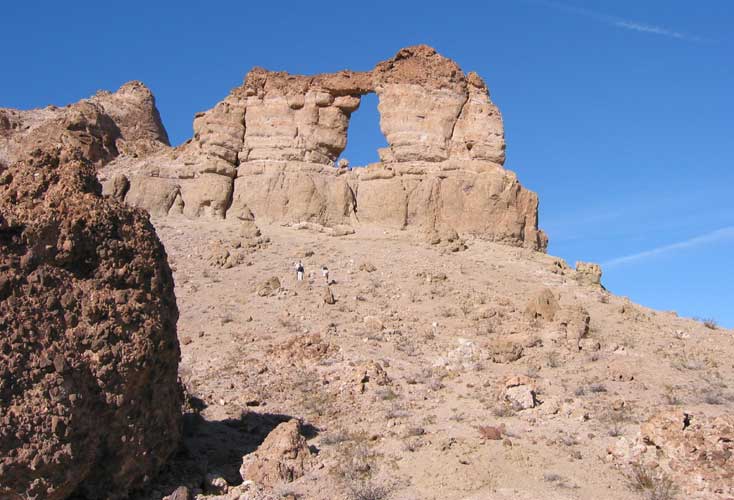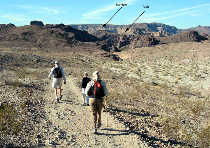 Liberty Bell Arch is in the Lake Mead NRA. It is a 5 mile round trip with 100 feet of "net" gain that comes in the form of maybe 500' down and 600' up. From the parking lot we could clearly see our destination, an overlook 1,000 feet above the river, and the formation that holds the arch.