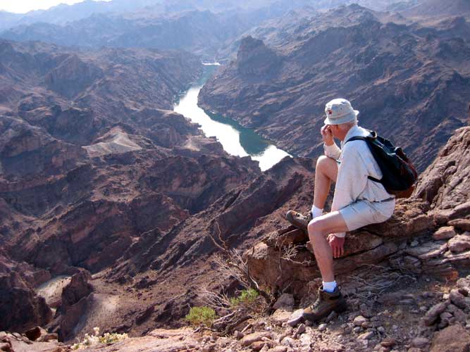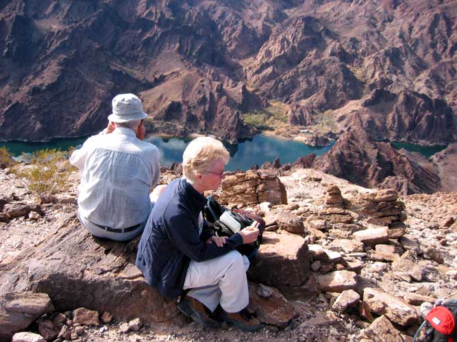 Our final ascent to the viewpoint was rewarded with the contrasting colors of the green river flowing through the dark rock of the canyon. This has to be one of the most spectacular views in Las Vegas. We had lunch at the edge of the cliff 1,000' above the Colorado River and watched as a couple of boats disturbed the mirror-like surface of the water.