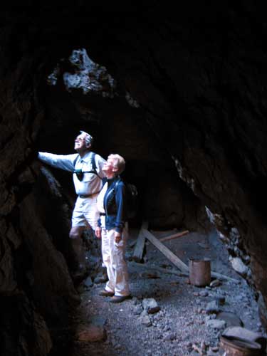 Along the trail we came to an abandoned gold mining operation. Carol and Howard decided to reach it by going over the ridge behind the abandoned machinery, and scrambling down the slick rock (descending from the right in this photo). What's left of the mine is maybe 100' of tunnel with two openings, probably resulting from cave-ins. The camera caught our intrepid duo in the spotlight of sun's rays streaming through one of the cave-ins.